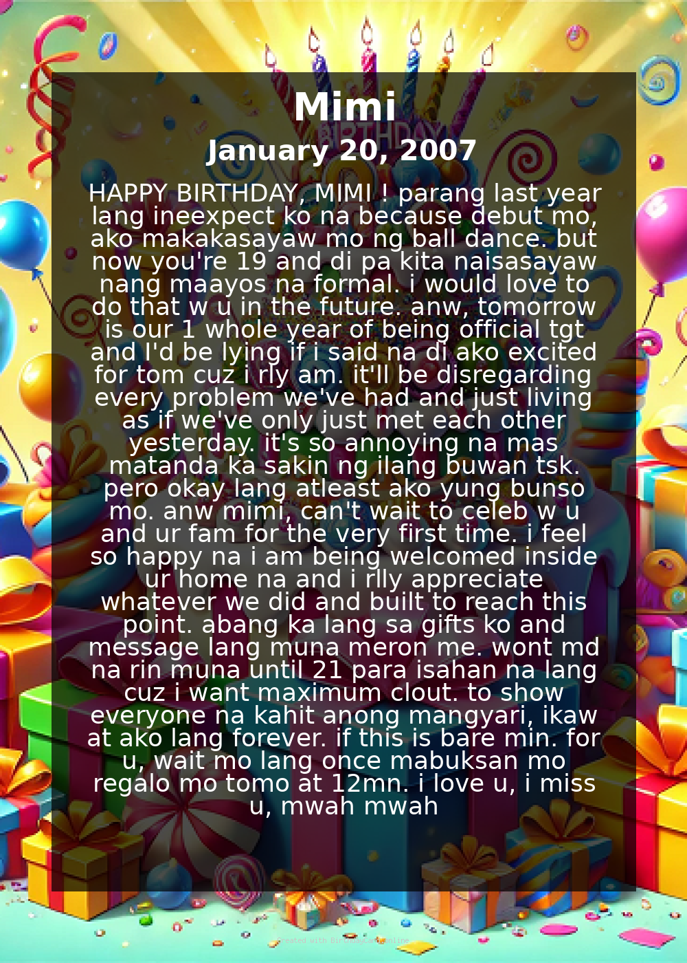 parang last year lang ineexpect ko na because debut mo, ako makakasayaw mo ng ball dance. but now you're 19 and di pa kita naisasayaw nang maayos na formal. i would love to do that w u in the future. anw, tomorrow is our 1 whole year of being official tgt and I'd be lying if i said na di ako excited for tom cuz i rly am. it'll be disregarding every problem we've had and just living as if we've only just met each other yesterday. it's so annoying na mas matanda ka sakin ng ilang buwan tsk. pero okay lang atleast ako yung bunso mo. anw mimi, can't wait to celeb w u and ur fam for the very first time. i feel so happy na i am being welcomed inside ur home na and i rlly appreciate whatever we did and built to reach this point. abang ka lang sa gifts ko and message lang muna meron me. wont md na rin muna until 21 para isahan na lang cuz i want maximum clout. to show everyone na kahit anong mangyari, ikaw at ako lang forever. if this is bare min. for u, wait mo lang once mabuksan mo regalo mo tomo at 12mn. i love u, i miss u, mwah mwah 😚