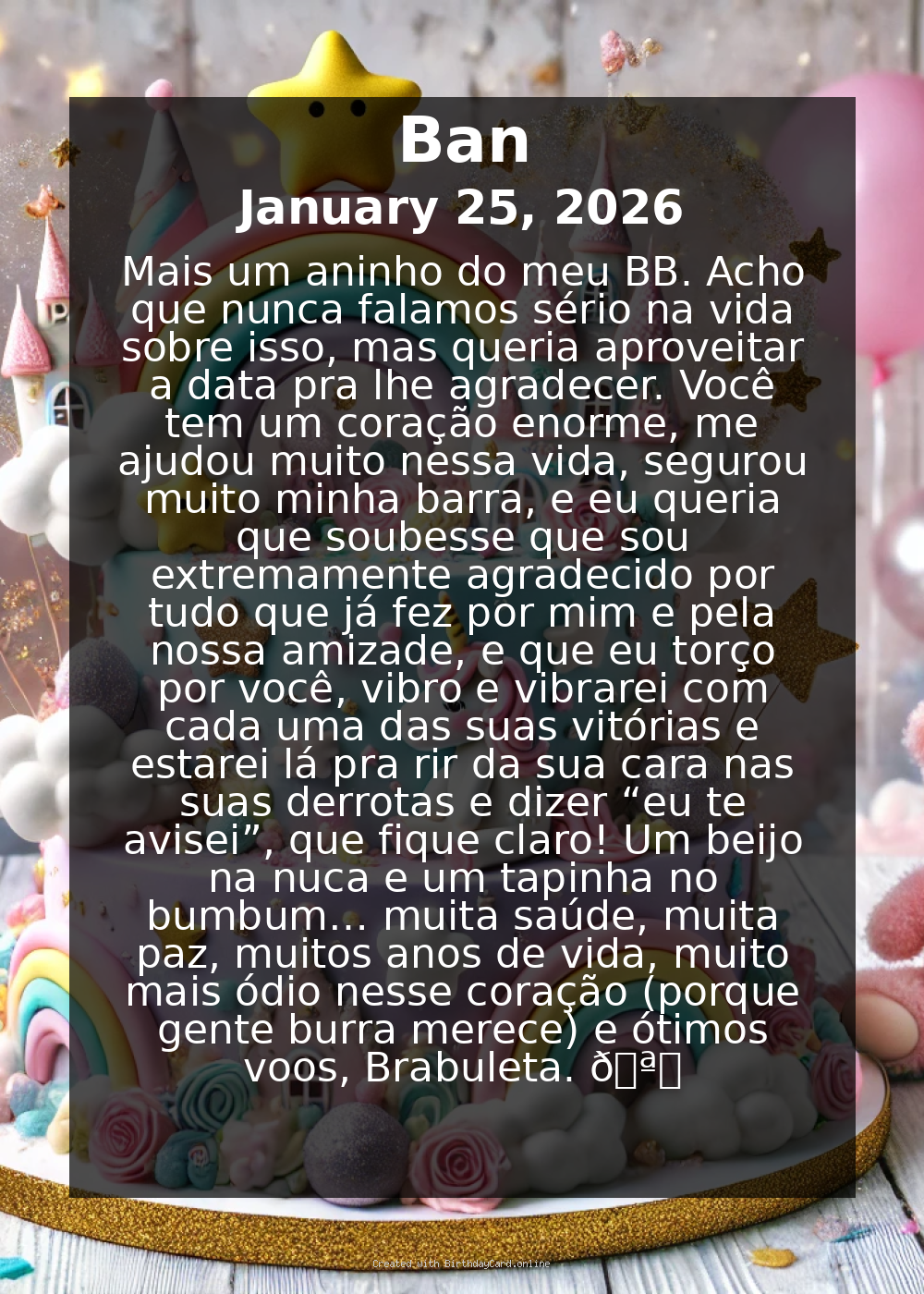 Acho que nunca falamos sério na vida sobre isso, mas queria aproveitar a data pra lhe agradecer. Você tem um coração enorme, me ajudou muito nessa vida, segurou muito minha barra, e eu queria que soubesse que sou extremamente agradecido por tudo que já fez por mim e pela nossa amizade, e que eu torço por você, vibro e vibrarei com cada uma das suas vitórias e estarei lá pra rir da sua cara nas suas derrotas e dizer “eu te avisei”, que fique claro!