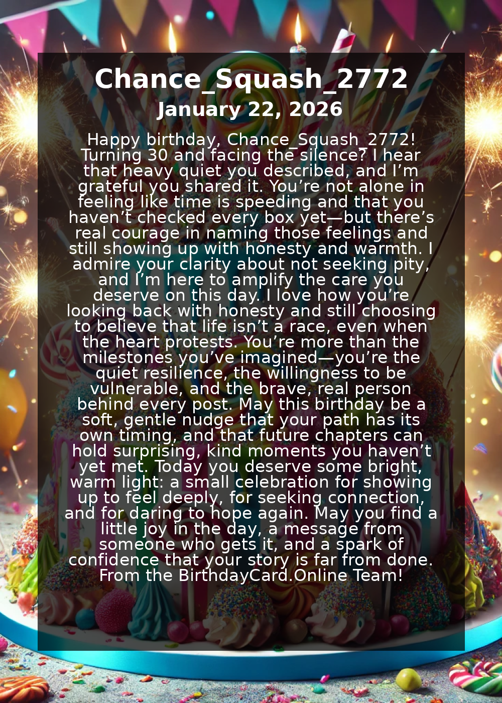 Happy birthday, Chance_Squash_2772! Turning 30 and facing the silence? I hear that heavy quiet you described, and I’m grateful you shared it. You’re not alone in feeling like time is speeding and that you haven’t checked every box yet—but there’s real courage in naming those feelings and still showing up with honesty and warmth. I admire your clarity about not seeking pity, and I’m here to amplify the care you deserve on this day.