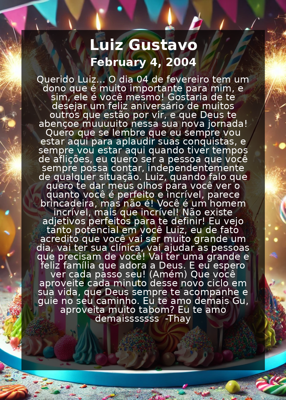 O dia 04 de fevereiro tem um dono que é muito importante para mim, e sim, ele é você mesmo! Gostaria de te desejar um feliz aniversário de muitos outros que estão por vir, e que Deus te abençoe muuuuito nessa sua nova jornada!