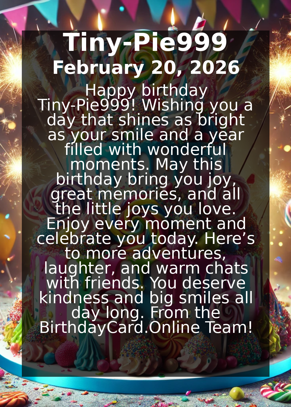 Happy birthday Tiny-Pie999! Wishing you a day that shines as bright as your smile and a year filled with wonderful moments. May this birthday bring you joy, great memories, and all the little joys you love. Enjoy every moment and celebrate you today.