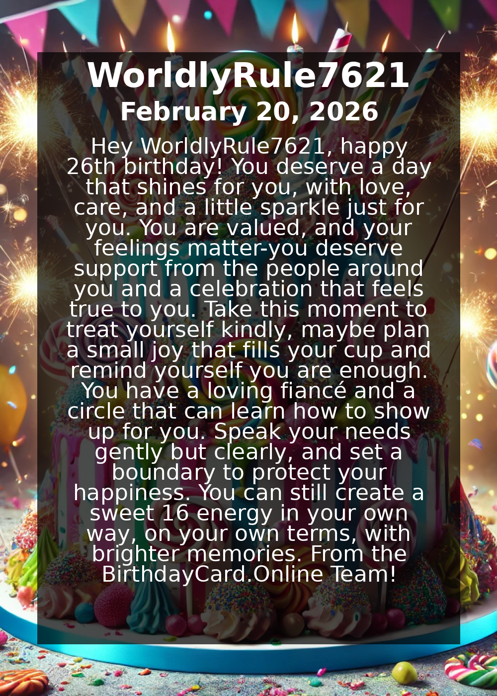 Hey WorldlyRule7621, happy 26th birthday! You deserve a day that shines for you, with love, care, and a little sparkle just for you. You are valued, and your feelings matter-you deserve support from the people around you and a celebration that feels true to you. Take this moment to treat yourself kindly, maybe plan a small joy that fills your cup and remind yourself you are enough.