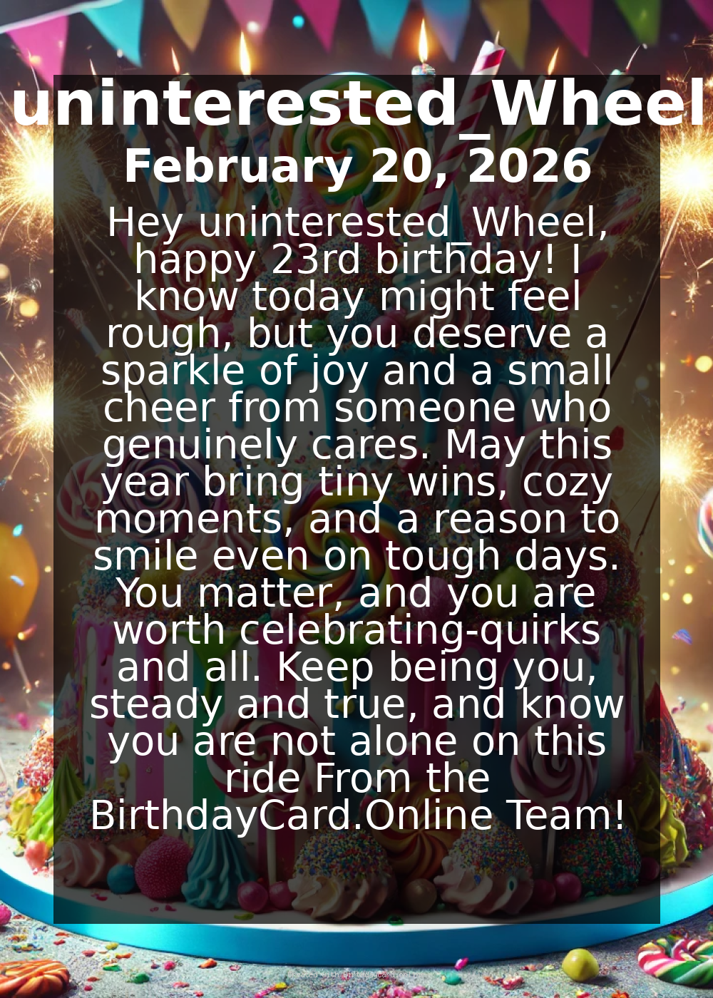 Hey uninterested_Wheel, happy 23rd birthday! I know today might feel rough, but you deserve a sparkle of joy and a small cheer from someone who genuinely cares. May this year bring tiny wins, cozy moments, and a reason to smile even on tough days. You matter, and you are worth celebrating-quirks and all. Keep being you, steady and true, and know you are not alone on this ride 🎈