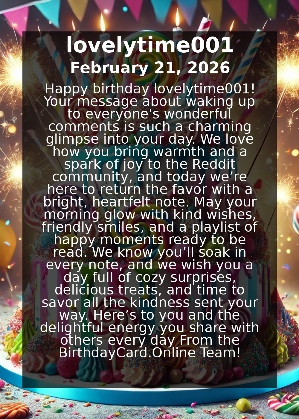 Happy birthday lovelytime001! Your message about waking up to everyone's wonderful comments is such a charming glimpse into your day. We love how you bring warmth and a spark of joy to the Reddit community, and today we’re here to return the favor with a bright, heartfelt note. May your morning glow with kind wishes, friendly smiles, and a playlist of happy moments ready to be read.