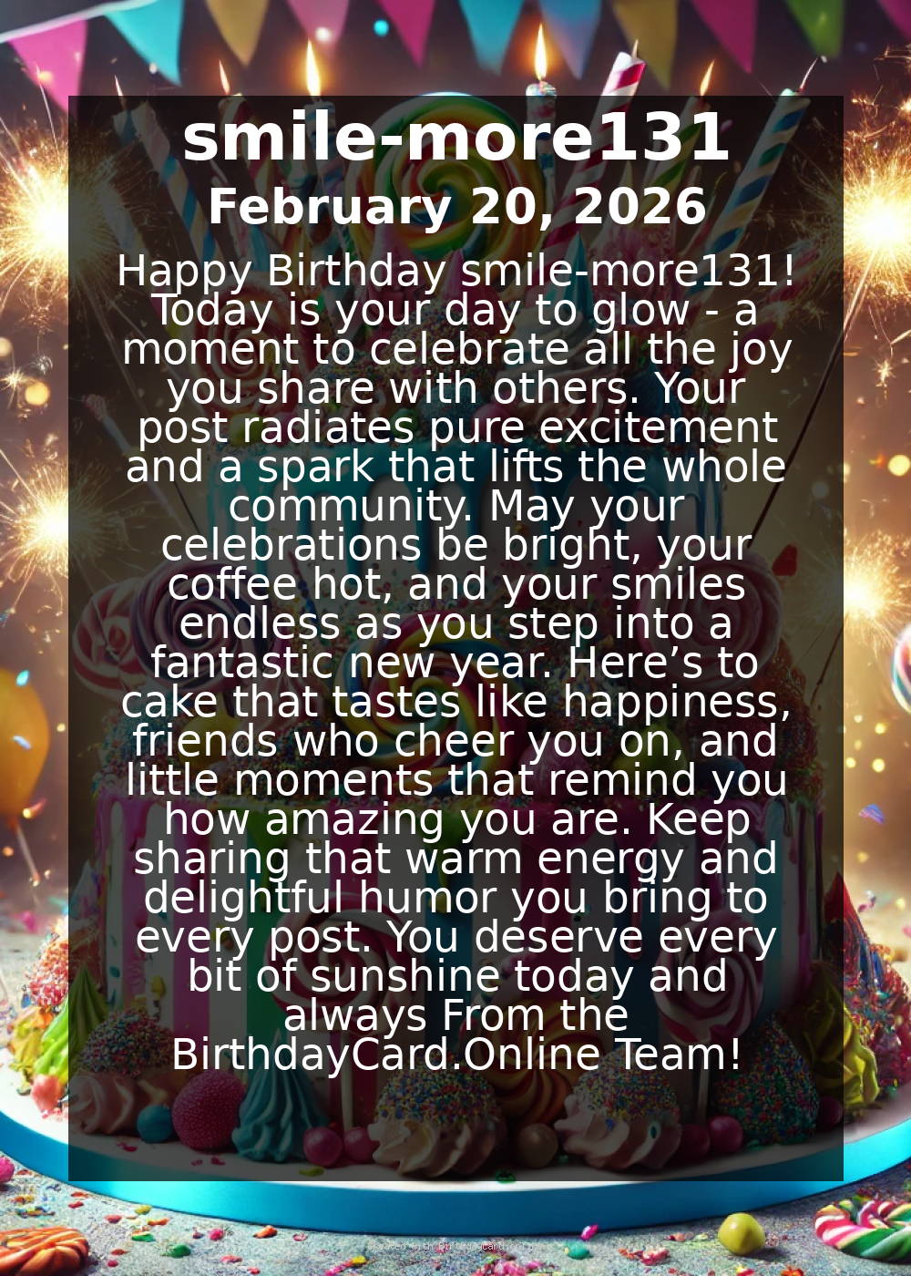 Happy Birthday smile-more131! Today is your day to glow - a moment to celebrate all the joy you share with others. Your post radiates pure excitement and a spark that lifts the whole community. May your celebrations be bright, your coffee hot, and your smiles endless as you step into a fantastic new year.