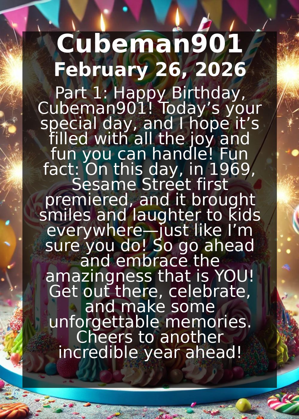 Part 1: Happy Birthday, Cubeman901! 🎉 Today’s your special day, and I hope it’s filled with all the joy and fun you can handle! Fun fact: On this day, in 1969, Sesame Street first premiered, and it brought smiles and laughter to kids everywhere—just like I’m sure you do! So go ahead and embrace the amazingness that is YOU! Get out there, celebrate, and make some unforgettable memories. Cheers to another incredible year ahead!