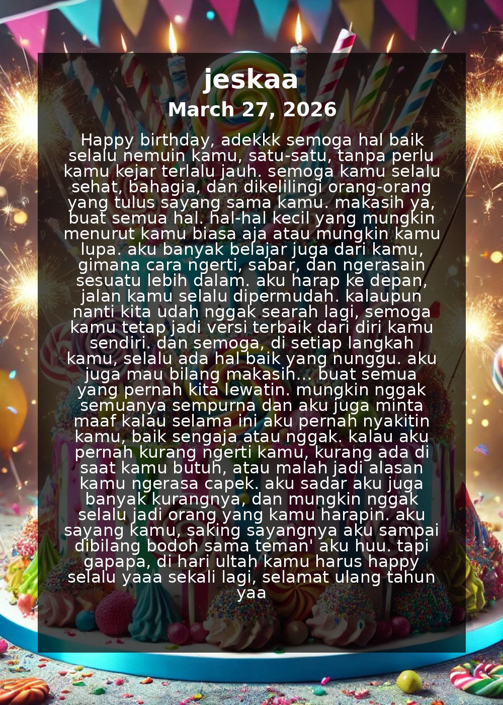 semoga hal baik selalu nemuin kamu, satu-satu, tanpa perlu kamu kejar terlalu jauh. semoga kamu selalu sehat, bahagia, dan dikelilingi orang-orang yang tulus sayang sama kamu. makasih ya, buat semua hal. hal-hal kecil yang mungkin menurut kamu biasa aja atau mungkin kamu lupa. aku banyak belajar juga dari kamu, gimana cara ngerti, sabar, dan ngerasain sesuatu lebih dalam. aku harap ke depan, jalan kamu selalu dipermudah. kalaupun nanti kita udah nggak searah lagi, semoga kamu tetap jadi versi terbaik dari diri kamu sendiri. dan semoga, di setiap langkah kamu, selalu ada hal baik yang nunggu. aku juga mau bilang makasih… buat semua yang pernah kita lewatin. mungkin nggak semuanya sempurna dan aku juga minta maaf kalau selama ini aku pernah nyakitin kamu, baik sengaja atau nggak. kalau aku pernah kurang ngerti kamu, kurang ada di saat kamu butuh, atau malah jadi alasan kamu ngerasa capek. aku sadar aku juga banyak kurangnya, dan mungkin nggak selalu jadi orang yang kamu harapin. aku sayang kamu, saking sayangnya aku sampai dibilang bodoh sama teman' aku huu. tapi gapapa, di hari ultah kamu harus happy selalu yaaa