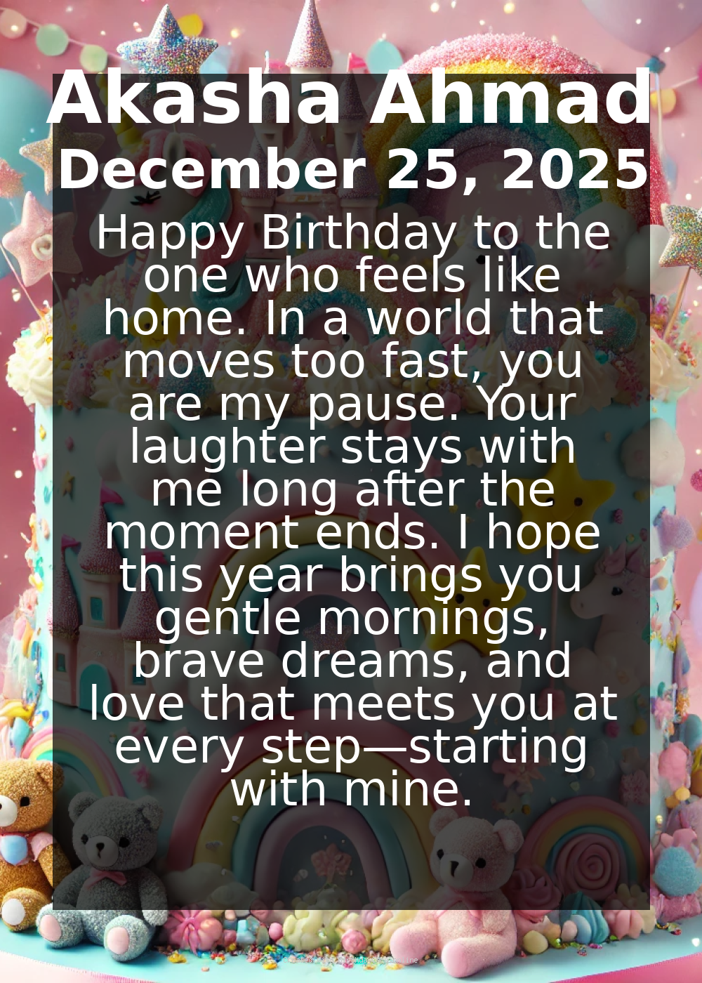 In a world that moves too fast, you are my pause. Your laughter stays with me long after the moment ends. I hope this year brings you gentle mornings, brave dreams, and love that meets you at every step—starting with mine. 🌸
