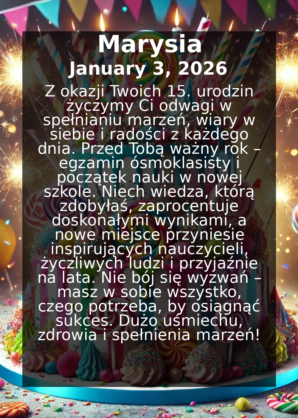 Z okazji Twoich 15. urodzin życzymy Ci odwagi w spełnianiu marzeń, wiary w siebie i radości z każdego dnia. Przed Tobą ważny rok – egzamin ósmoklasisty i początek nauki w nowej szkole. Niech wiedza, którą zdobyłaś, zaprocentuje doskonałymi wynikami, a nowe miejsce przyniesie inspirujących nauczycieli, życzliwych ludzi i przyjaźnie na lata. Nie bój się wyzwań – masz w sobie wszystko, czego potrzeba, by osiągnąć sukces. Dużo uśmiechu, zdrowia i spełnienia marzeń!