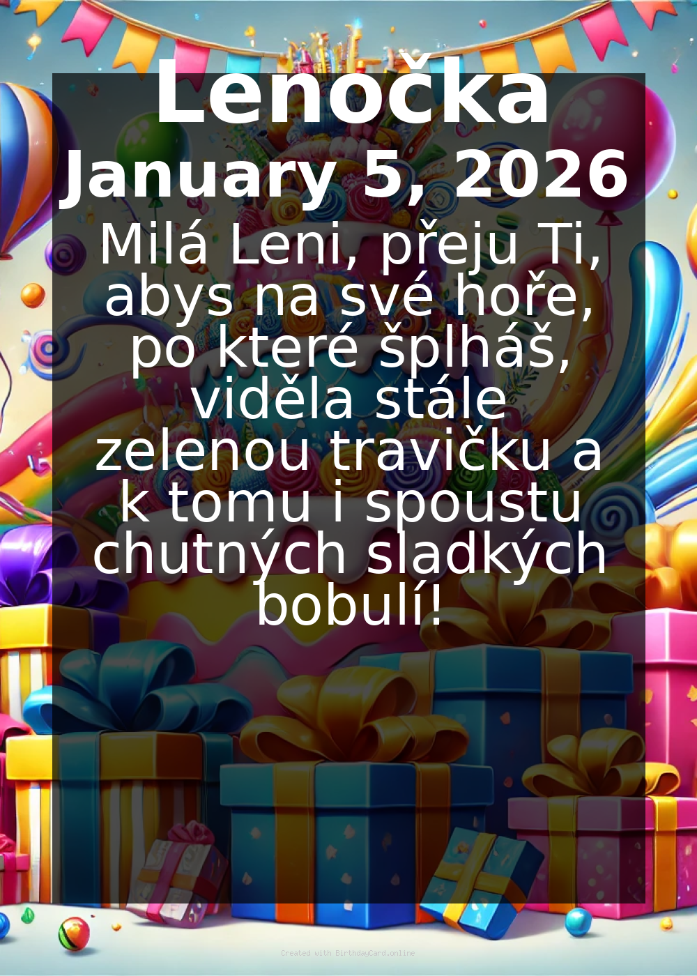 Milá Leni, přeju Ti, abys na své hoře, po které šplháš, viděla stále zelenou travičku a k tomu i spoustu chutných sladkých bobulí!