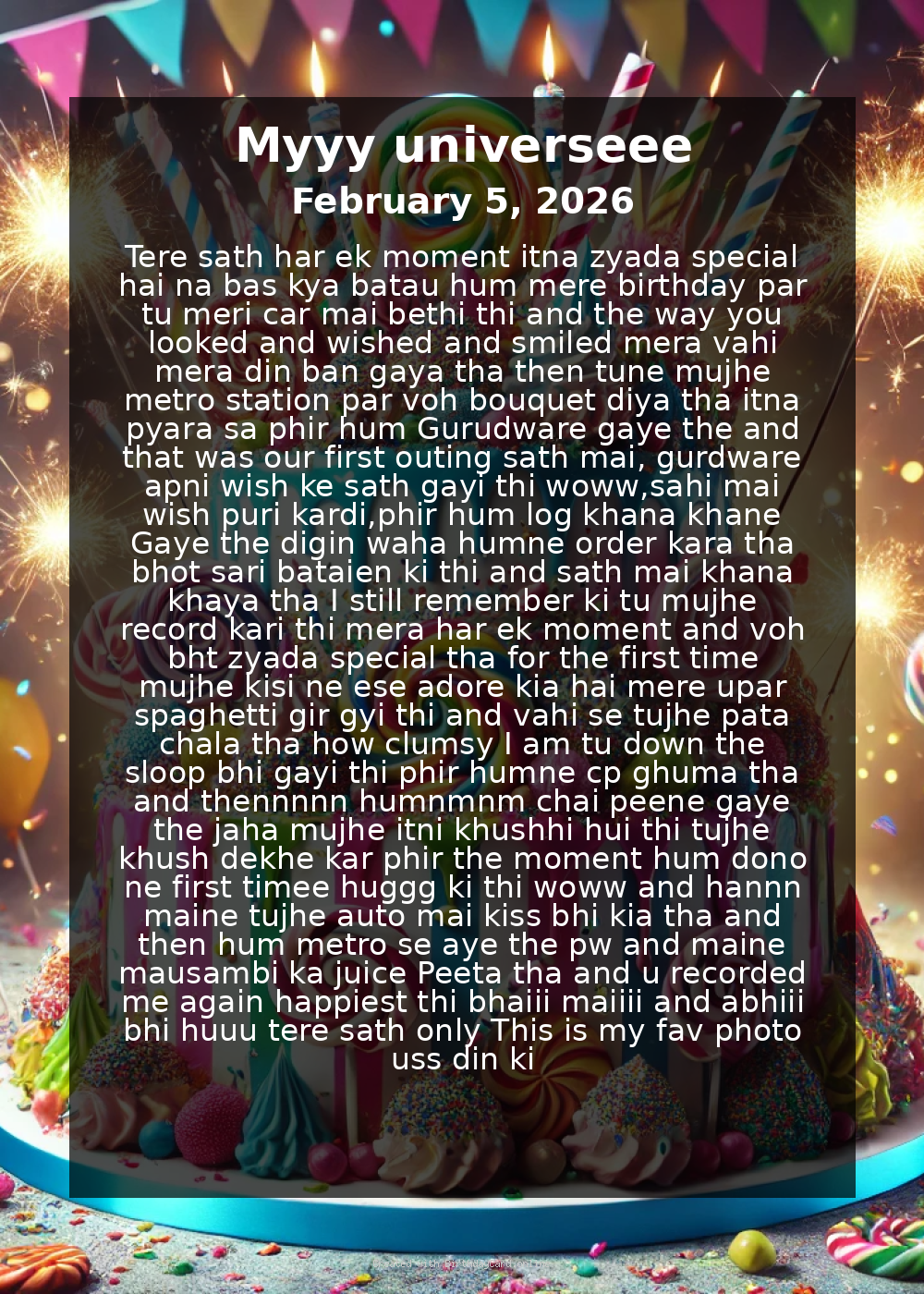 Tere sath har ek moment itna zyada special hai na bas kya batau hum mere birthday par tu meri car mai bethi thi and the way you looked and wished and smiled mera vahi mera din ban gaya tha then tune mujhe metro station par voh bouquet diya tha itna pyara sa phir hum Gurudware gaye the and that was our first outing sath mai, gurdware apni wish ke sath gayi thi woww,sahi mai wish puri kardi,phir hum log khana khane Gaye the digin waha humne order kara tha bhot sari bataien ki thi and sath mai khana khaya tha I still remember ki tu mujhe record kari thi mera har ek moment and voh bht zyada special tha for the first time mujhe kisi ne ese adore kia hai mere upar spaghetti gir gyi thi and vahi se tujhe pata chala tha how clumsy I am tu down the sloop bhi gayi thi 😁😌phir humne cp ghuma tha and thennnnn humnmnm chai peene gaye the jaha mujhe itni khushhi hui thi tujhe khush dekhe kar phir the moment hum dono ne first timee huggg ki thi woww and hannn maine tujhe auto mai kiss bhi kia tha and then hum metro se aye the pw and maine mausambi ka juice Peeta tha and u recorded me again happiest thi bhaiii maiiii 😘💖 and abhiii bhi huuu tere sath only
