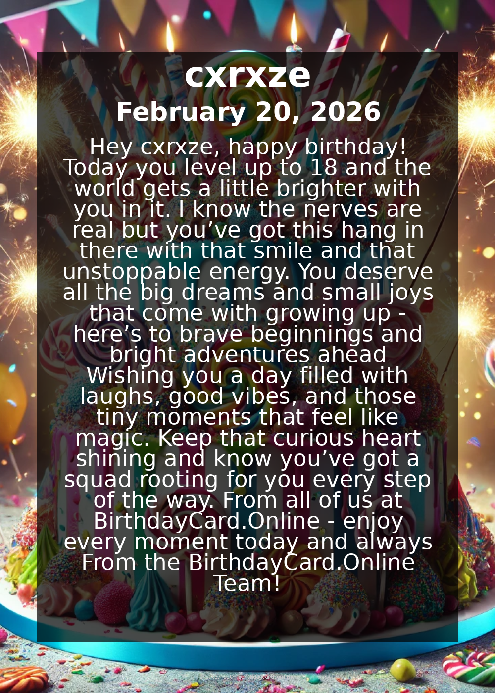 Hey cxrxze, happy birthday! Today you level up to 18 and the world gets a little brighter with you in it. I know the nerves are real but you’ve got this hang in there with that smile and that unstoppable energy. You deserve all the big dreams and small joys that come with growing up - here’s to brave beginnings and bright adventures ahead 🎉