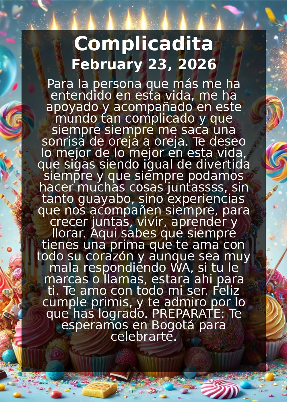 Para la persona que más me ha entendido en esta vida, me ha apoyado y acompañado en este mundo tan complicado y que siempre siempre me saca una sonrisa de oreja a oreja. Te deseo lo mejor de lo mejor en esta vida, que sigas siendo igual de divertida siempre y que siempre podamos hacer muchas cosas juntassss, sin tanto guayabo, sino experiencias que nos acompañen siempre, para crecer juntas, vivir, aprender y llorar. Aqui sabes que siempre tienes una prima que te ama con todo su corazón y aunque sea muy mala respondiendo WA, si tu le marcas o llamas, estara ahi para ti. Te amo con todo mi ser. Feliz cumple primis, y te admiro por lo que has logrado.