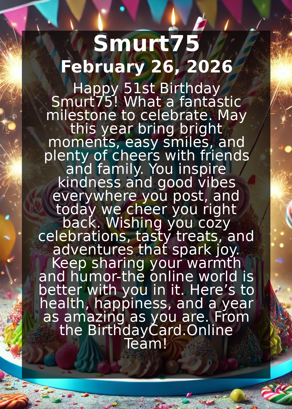 Happy 51st Birthday Smurt75! πŸŽ‰ What a fantastic milestone to celebrate. May this year bring bright moments, easy smiles, and plenty of cheers with friends and family. You inspire kindness and good vibes everywhere you post, and today we cheer you right back.