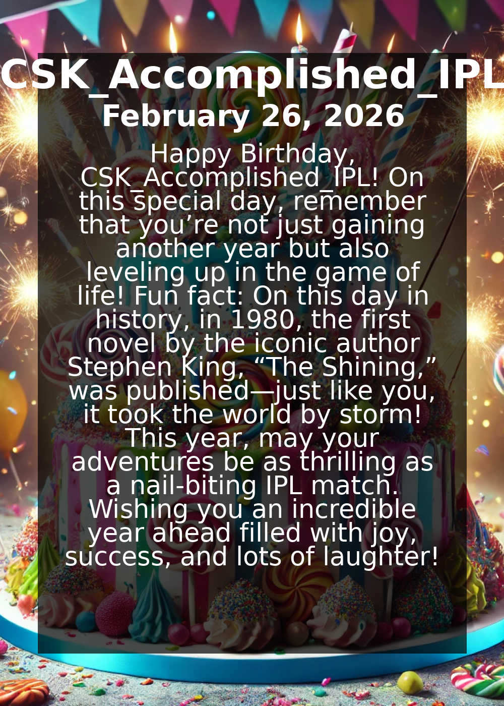 Happy Birthday, CSK_Accomplished_IPL! 🎉 On this special day, remember that you’re not just gaining another year but also leveling up in the game of life! Fun fact: On this day in history, in 1980, the first novel by the iconic author Stephen King, “The Shining,” was published—just like you, it took the world by storm! This year, may your adventures be as thrilling as a nail-biting IPL match. Wishing you an incredible year ahead filled with joy, success, and lots of laughter!