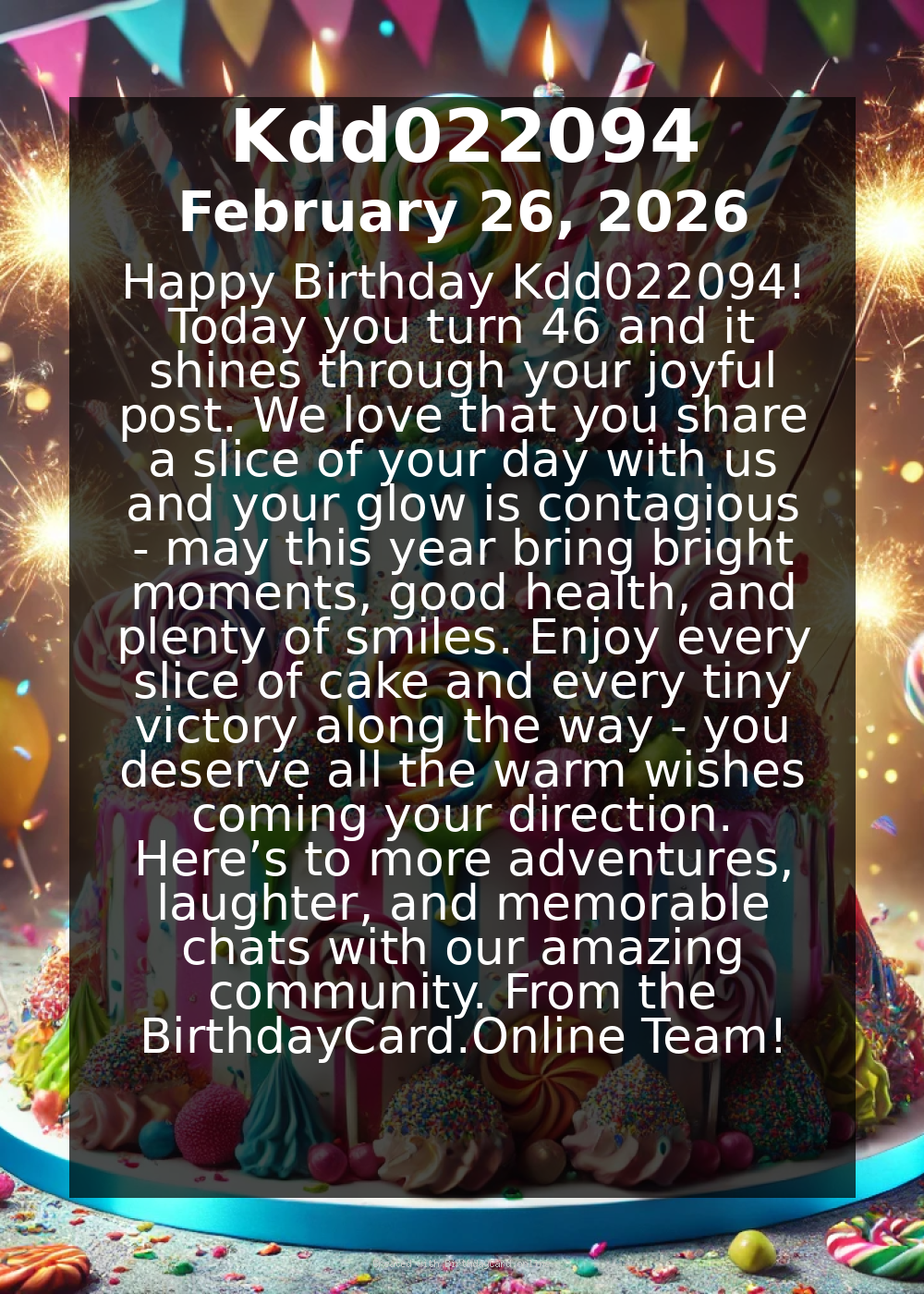 Happy Birthday Kdd022094! Today you turn 46 and it shines through your joyful post. We love that you share a slice of your day with us and your glow is contagious - may this year bring bright moments, good health, and plenty of smiles. Enjoy every slice of cake and every tiny victory along the way - you deserve all the warm wishes coming your direction. Here’s to more adventures, laughter, and memorable chats with our amazing community. πŸŽ‰πŸŽ‚