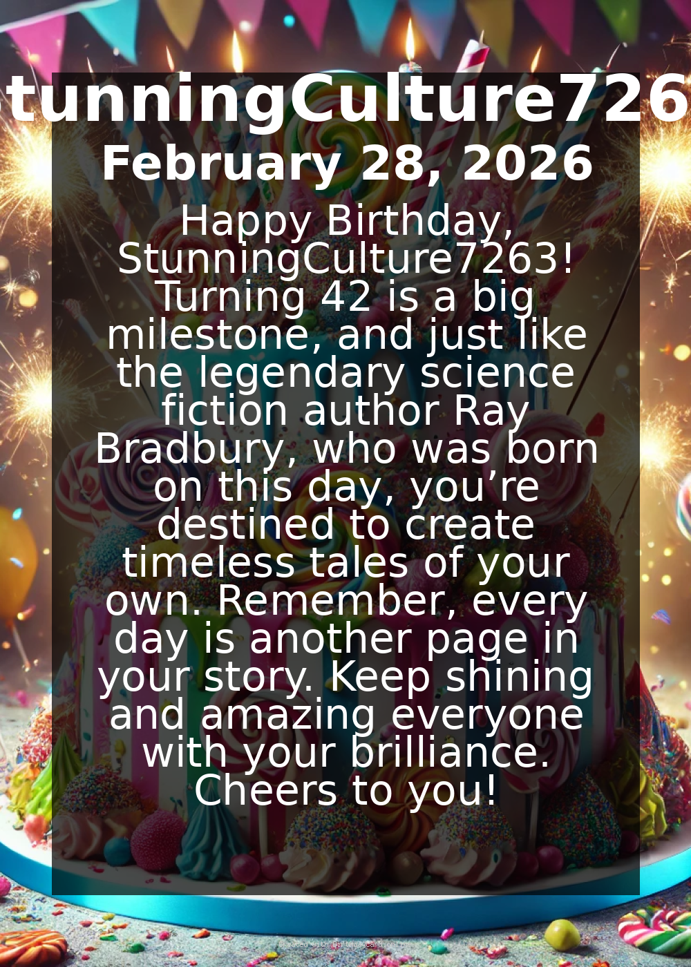 Happy Birthday, StunningCulture7263! Turning 42 is a big milestone, and just like the legendary science fiction author Ray Bradbury, who was born on this day, you’re destined to create timeless tales of your own. Remember, every day is another page in your story. Keep shining and amazing everyone with your brilliance. Cheers to you!