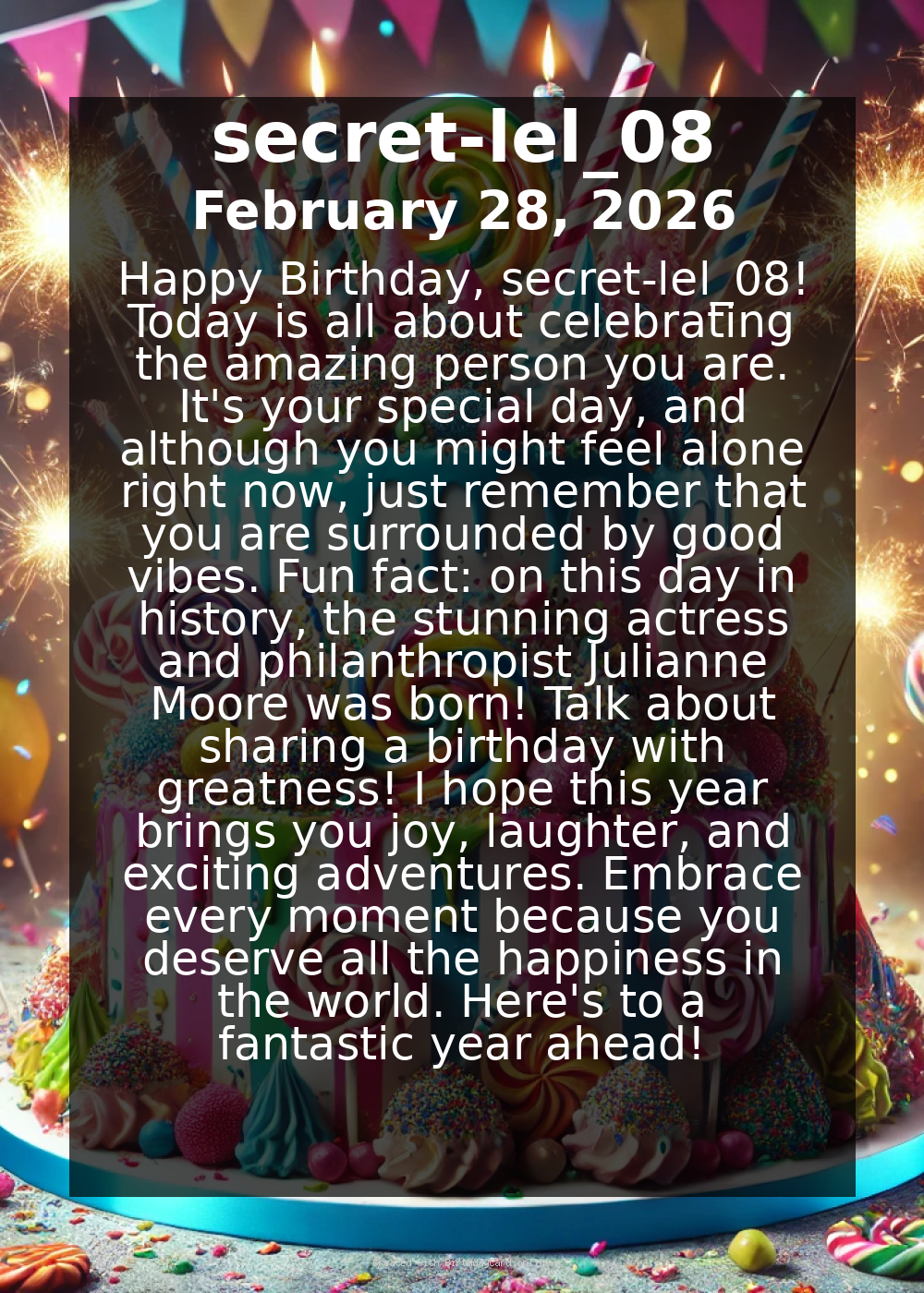Happy Birthday, secret-lel_08! 🎉 Today is all about celebrating the amazing person you are. It's your special day, and although you might feel alone right now, just remember that you are surrounded by good vibes. Fun fact: on this day in history, the stunning actress and philanthropist Julianne Moore was born! Talk about sharing a birthday with greatness! I hope this year brings you joy, laughter, and exciting adventures. Embrace every moment because you deserve all the happiness in the world. Here's to a fantastic year ahead!