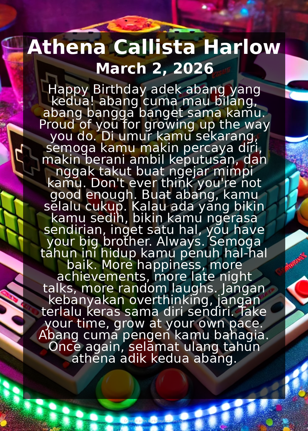 Happy Birthday adek abang yang kedua! abang cuma mau bilang, abang bangga banget sama kamu. Proud of you for growing up the way you do. Di umur kamu sekarang, semoga kamu makin percaya diri, makin berani ambil keputusan, dan nggak takut buat ngejar mimpi kamu. Don't ever think you're not good enough. Buat abang, kamu selalu cukup. Kalau ada yang bikin kamu sedih, bikin kamu ngerasa sendirian, inget satu hal, you have your big brother. Always. Semoga tahun ini hidup kamu penuh hal-hal baik. More happiness, more achievements, more late night talks, more random laughs. Jangan kebanyakan overthinking, jangan terlalu keras sama diri sendiri. Take your time, grow at your own pace. Abang cuma pengen kamu bahagia. Once again, selamat ulang tahun athena adik kedua abang.🖤